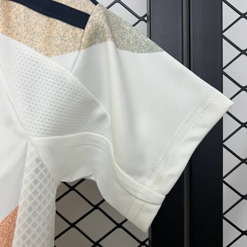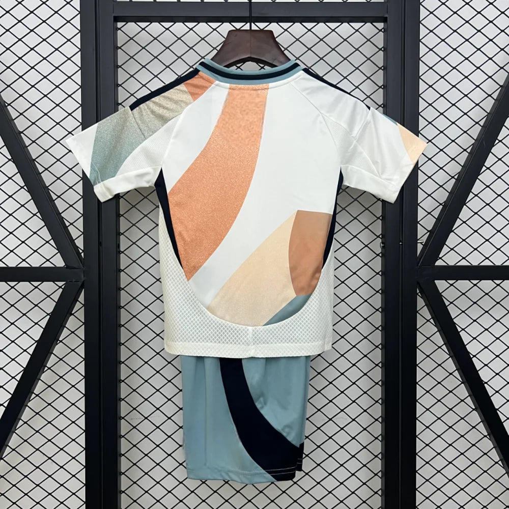 Diseño que impacta: equipación visitante para niño con una paleta elegante en tonos turquesa, salmón y blanco, detalles en azul marino y líneas dinámicas que evocan movimiento. Escudo y logotipo visibles en el pecho, integrados con estilo deportivo.